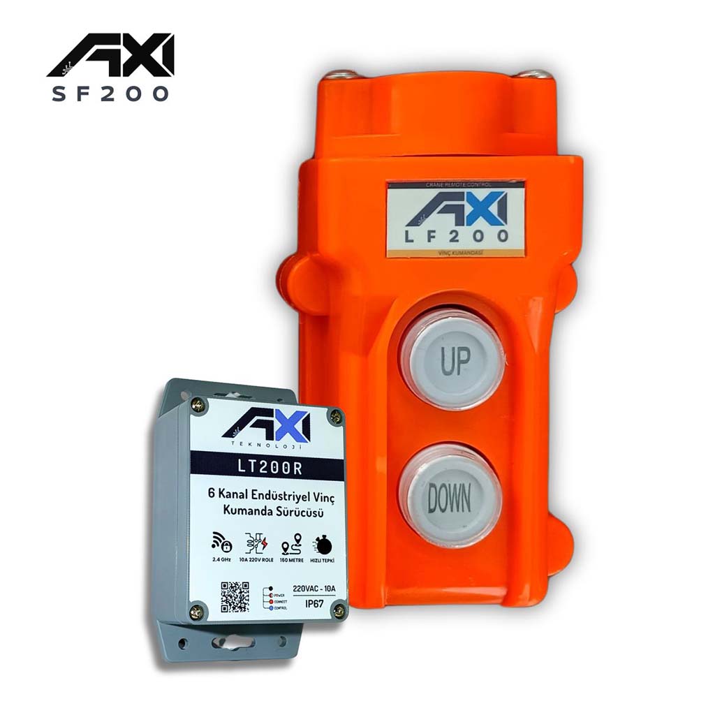 AXI SF100, endüstriyel kaldırma sistemleri için güvenli, uzun menzilli ve dayanıklı bir kablosuz kumanda çözümüdür. Set içerisinde yer alan LT200 kablosuz verici ve LF100R alıcı ünitesi birlikte çalışarak hem manuel hem uzaktan kontrol imkânı sağlar. Vinç, platform, kapı ve ağır iş makinesi uygulamalarında maksimum güvenlik ve kontrol sağlar.